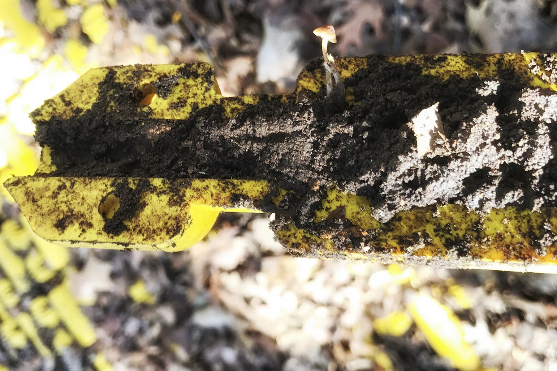 Earlier that morning, when my spirits were still high and I was able to smile at the cluster of walkers who lamented my position and posture, I’d reveled in noticing fungi implanted on and among the plastic pieces. A good portion of the work was also totally invisible under a layer of fallen leaves when I began and I was disturbing a plentiful population of worms, ants, and grubs in the removal process.